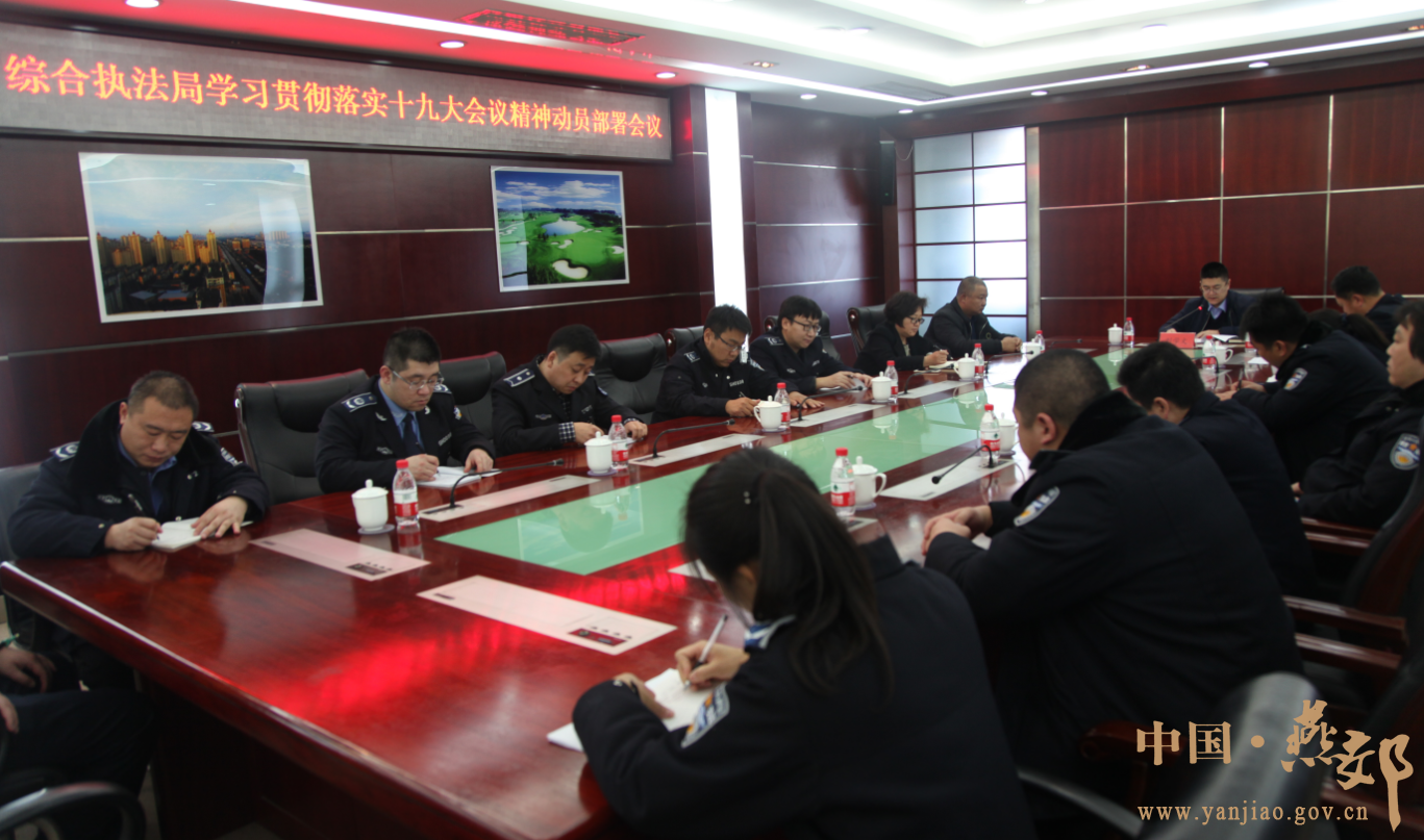 为深入贯彻落实党的十九大会议精神,11月15日,燕郊高新区城市管理综合执法局召开全体党员干部会议,集中学习并传达了党的十九大会议精神,局长刘学文在会上强调,全局党员干部要高度重视、认真学习、深刻领会党的十九大精神,牢固树立“四个意识”,做到思想上、政治上、行动上与以习近平为核心的党中央保持高度一致,确保十九大精神在城市管理日常工作中不折不扣得到贯彻落实。